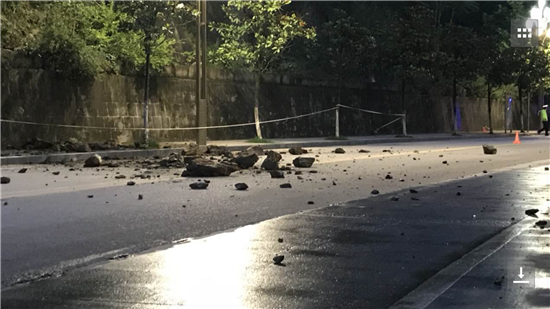 接到報(bào)警后,大隊(duì)及專職隊(duì)迅速出動兩輛消防車和10名官兵趕赴現(xiàn)場進(jìn)行處置,到達(dá)現(xiàn)場后,指揮員迅速帶領(lǐng)4名戰(zhàn)斗員立即對險情進(jìn)行偵查。通過現(xiàn)場偵查,發(fā)現(xiàn)在距離路面高約50米的山梁上,幾個石塊直徑約1米大小,由于連續(xù)幾日暴雨,石塊下土層已經(jīng)流失,導(dǎo)致石塊部分懸空,隨時都有掉落的危險。此時已近夜晚,模糊不清的環(huán)境無形中增加現(xiàn)場處置的難度。指揮員下令,分兩組進(jìn)行處置,一組由5名戰(zhàn)斗員跟隨一名熟悉該山道路的群眾一起上山,處置"懸石”險情,一組與交警部門拉起警戒線隔離過往車輛和行人。由于“懸石”處無路可通,戰(zhàn)斗員在上到山梁后,系上安全繩下降到懸石旁利用事先準(zhǔn)備好的鋼釬對石塊進(jìn)行起拗,在經(jīng)過兩個多小時的作業(yè)后,全部懸石終于掉落路面,使隱患徹底消除。