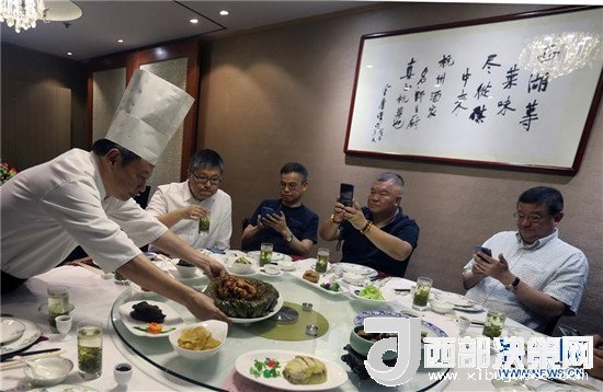 杭州酒家老板吳瑞康為客人端上自己親自制作的“叫化雞”(6月16日攝)。新華社記者 李鵬 攝