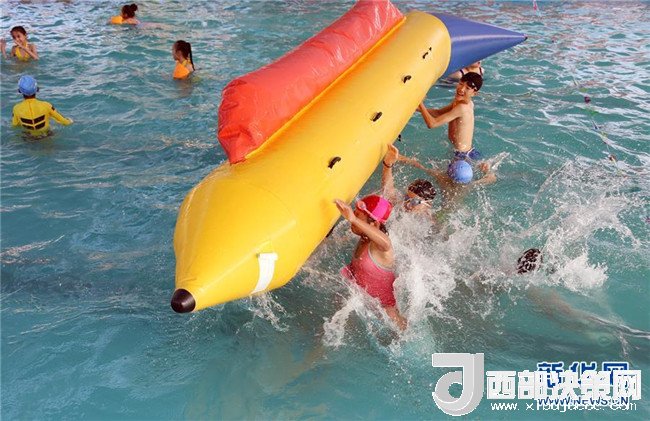 7月21日,小朋友在山東省棗莊市文化廣場游泳池內(nèi)戲水度暑。 新華社發(fā)(孫中喆 攝)