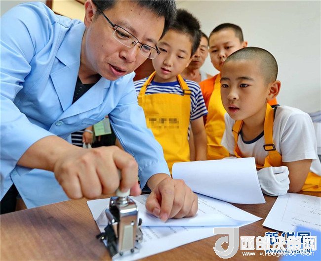 8月2日,河北秦皇島市檔案館工作人員向前來體驗檔案文化的海港區(qū)紅旗里社區(qū)的小朋友演示檔案處理裝訂的過程。