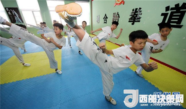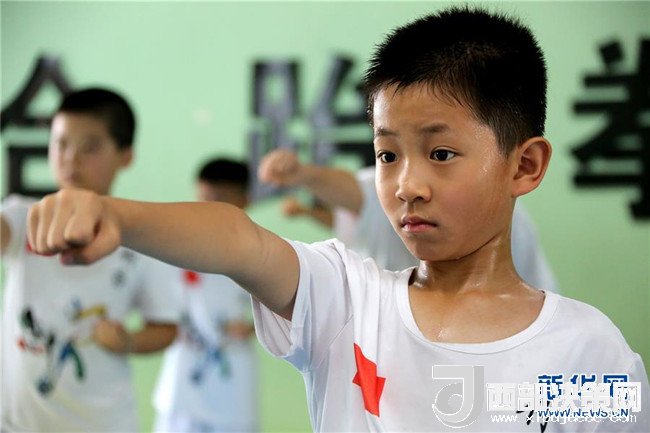 8月2日,小朋友在山東省棗莊市一家跆拳道館練習跆拳道。 新華社發(fā)(孫中喆 攝)