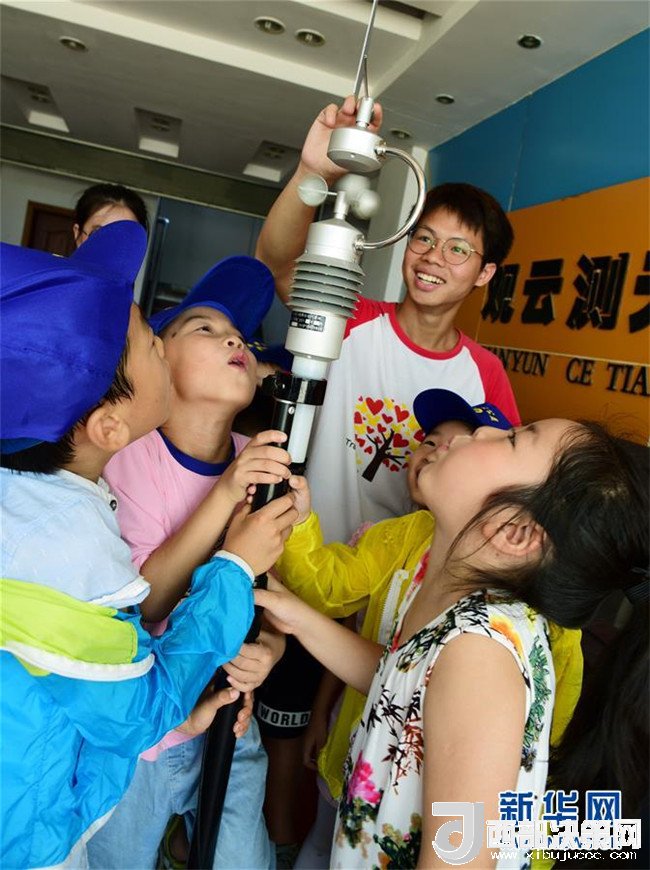 8月2日,江蘇鎮(zhèn)江市寶塔路街道潤州花園社區(qū)的小朋友在丹徒國家基本氣象站觀察體驗便攜自動氣象站的功能。 新華社發(fā)(石玉成 攝)