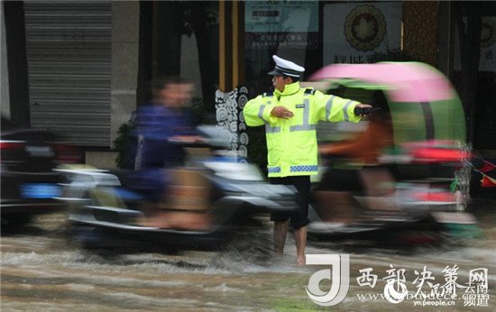 2018年8月4日,云南省昭通中心城市,一位交警赤腳冒雨在積水中指揮交通。攝影:張廣玉