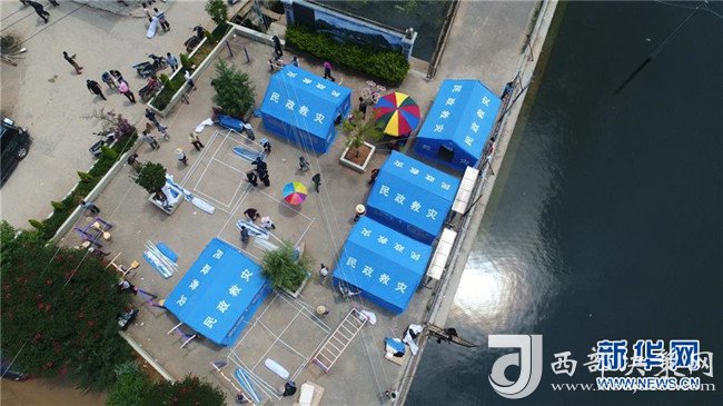 通??h四街鎮(zhèn)中搭起的救災(zāi)帳篷(8月13日無(wú)人機(jī)拍攝)。