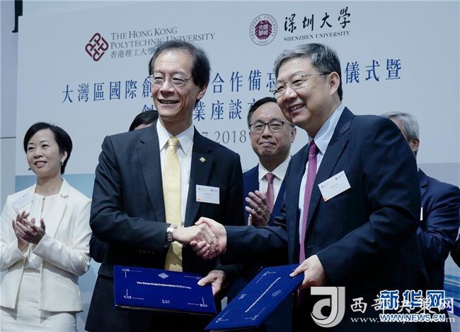 2018年7月18日,在香港理工大學,香港理工大學校長唐偉章和深圳大學校長李清泉(前右)簽署“大灣區(qū)國際創(chuàng)新學院”合作備忘錄后握手。新華社發(fā)(王申攝)