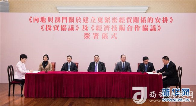 2017年12月18日拍攝的商務部與澳門特區(qū)政府《內地與澳門關于建立更緊密經貿關系的安排》(CEPA)下的《投資協議》和《經濟技術合作協議》簽約儀式現場。新華社記者張金加攝