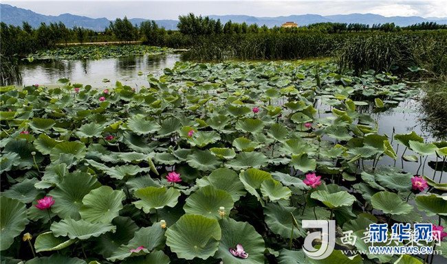 8月22日,游人在廣靈縣壺流河濕地觀賞盛開的荷花(無人機(jī)拍攝)。新華社記者 陶明 攝