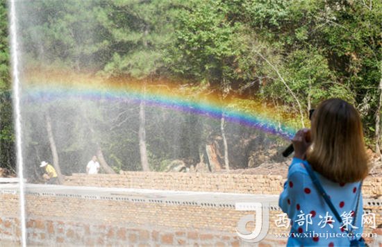在搖擺橋的旁邊,就是引來眾多體驗(yàn)者的“彩虹喊泉”游玩項(xiàng)目。游客使用話筒大聲呼喊,噴泉會根據(jù)音量的大小“舞蹈”,此時(shí)天空中像下起雨一般,雨過天晴,彩虹映入眼簾,浪漫的氛圍便由此營造而來。