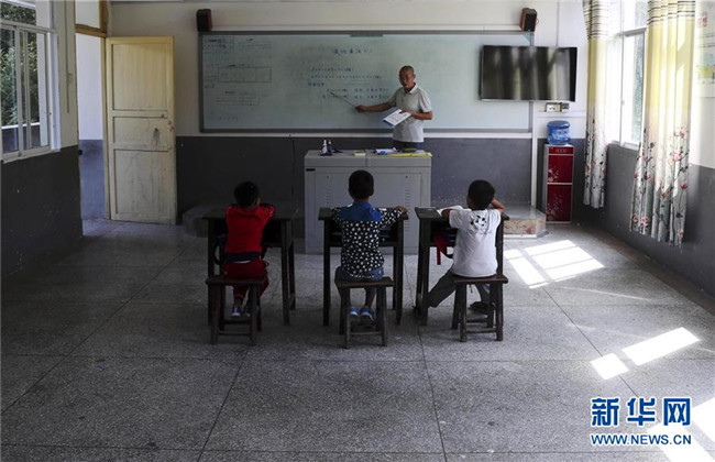 重慶市黔江區(qū)石家鎮(zhèn)滲壩小學是一所大山里的“微小學”,9月3日,這所“微小學”迎來了新學期。這學期3名老師承擔了9名學生的教學工作,其中二年級學生3名、三年級學生6名。新華社發(fā) 楊敏 攝