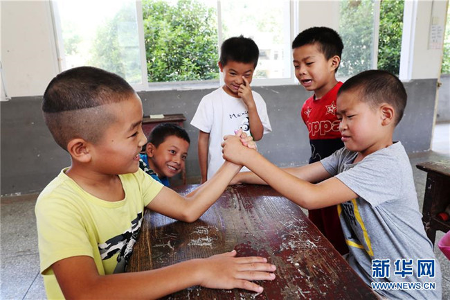 9月3日,重慶市黔江區(qū)石家鎮(zhèn)滲壩小學的學生在課間做游戲。