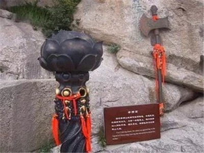 翠云宮西有一天然巨石,狀似斧劈,石旁置鐵斧一把,上鑄"仙家寶斧,七尺有五,賜于沉香,劈山救母"。相傳是沉香劈山救母之遺跡,名曰“斧劈石"。