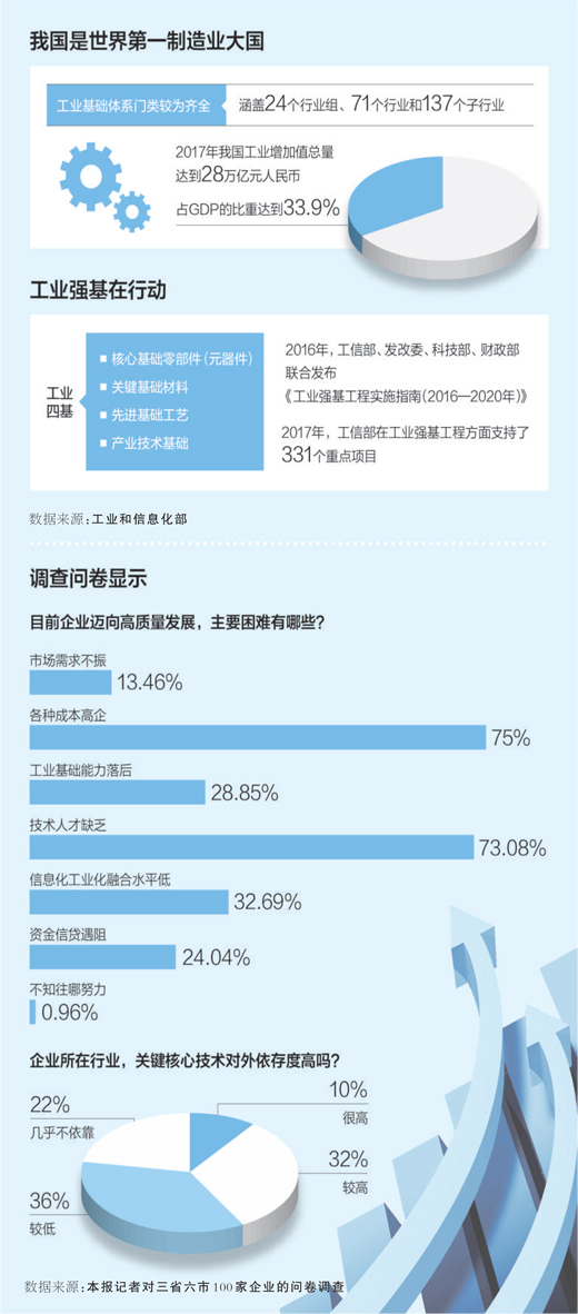 “要實現(xiàn)從‘有’到‘好’的轉(zhuǎn)變,在高端產(chǎn)品上突破,還需要時間。”調(diào)查中企業(yè)坦言,我國部分核心技術(shù)、關(guān)鍵產(chǎn)品和重大裝備仍存瓶頸制約,一些工業(yè)產(chǎn)品在一致性、穩(wěn)定性和使用壽命方面與國外先進水平差距較大,工業(yè)基礎(chǔ)須進一步夯實。