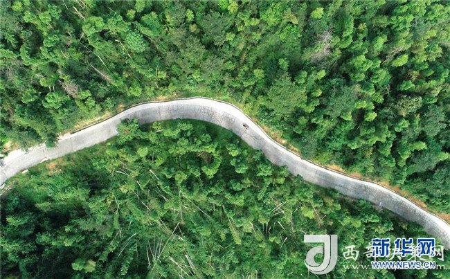 高自仁駕駛助力車行駛在前往梅嶺鎮(zhèn)立新村立新學(xué)校的山路上(9月4日無人機(jī)拍攝)。新華社記者 彭昭之?dāng)z