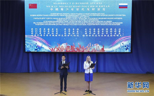 2018年9月12日,汶川地震后曾在兒童中心療養(yǎng)的北川男孩席浚斐(左)和中心輔導員娜塔莉亞共同宣讀《中俄青少年世代友好宣言》。 新華社記者謝環(huán)馳攝