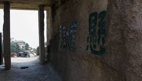 長空棧道筑在光溜溜的千仞絕壁上,真正接近90度,上望崖壁好幾十米,下望至少二、三百米不見谷底,棧道寬僅三十多公分,一邊空懸并無欄桿,一邊崖上釘有鐵索可供抓手。上下皆是懸崖絕壁,鐵索橫懸,由條石搭成尺許路面,下由石柱固定。這里只是探險(xiǎn)之道,并非登山必由之路,膽小的人在升表臺看看就行了,膽大的則可攀爬而上。所以石刻上不少警告之語:"懸崖勒馬"等。