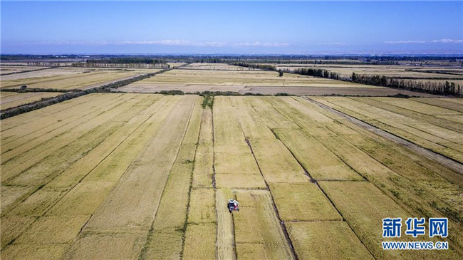 9月26日,收割機(jī)在新疆察布查爾錫伯自治縣納達(dá)齊牛錄鄉(xiāng)的一處稻田收割水稻。眼下,地處新疆伊犁河谷的察布查爾錫伯自治縣約20萬(wàn)畝水稻迎來(lái)收割季。當(dāng)?shù)剞r(nóng)民搶抓農(nóng)時(shí),忙碌在金色田園中。記者 胡虎虎 攝