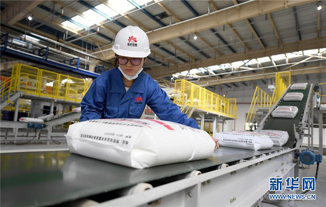 延安煤油氣資源綜合利用項目包裝車間的工作人員進行產(chǎn)品包裝檢查(9月28日攝)。新華社記者 劉瀟 攝