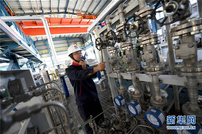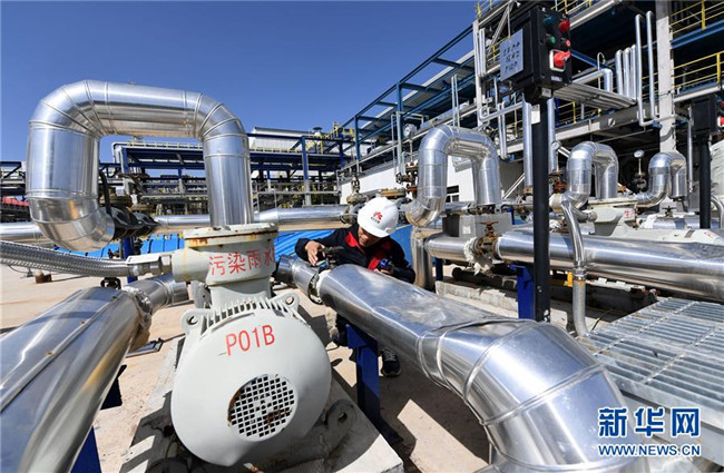 延安煤油氣資源綜合利用項目甲醇制烯烴中心的工作人員進行設(shè)備巡檢(9月28日攝)。新華社記者 劉瀟 攝