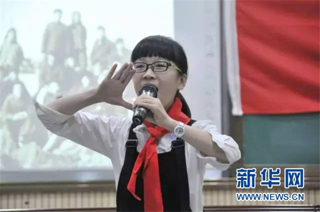 2016年5月31日晚,椒江區(qū)一名小學(xué)生在有關(guān)學(xué)習(xí)墾荒精神的主題班會(huì)上發(fā)言。新華社記者 王俊祿 攝