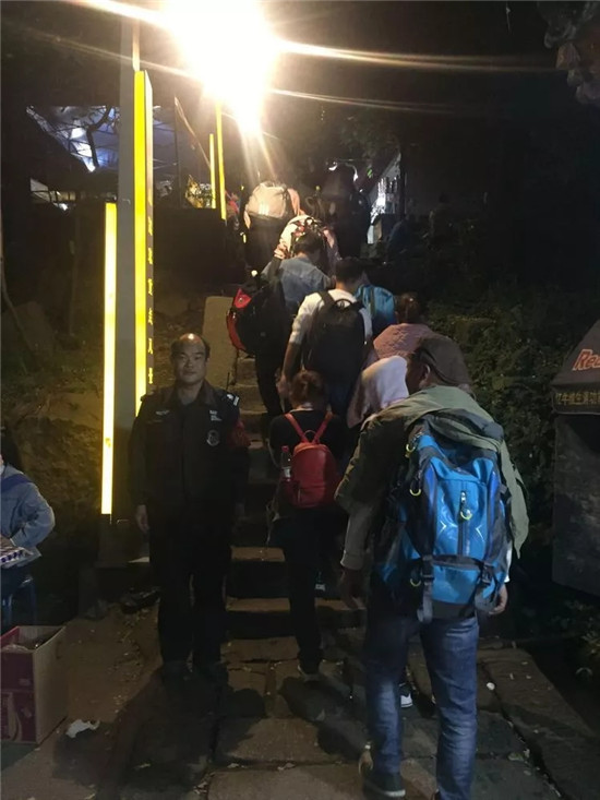 深夜執(zhí)勤人員堅守崗位維護游覽秩序、主峰區(qū)執(zhí)勤人員勸阻游客遠離危險地帶,注意夜晚游覽安全