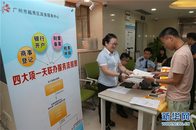 7月19日,“四大項(xiàng)一天聯(lián)辦服務(wù)專窗”在廣州市越秀區(qū)政務(wù)服務(wù)中心亮相,工作人員將營(yíng)業(yè)執(zhí)照遞交給申請(qǐng)者。 新華社記者 張加揚(yáng) 攝