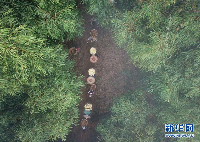 10月14日,在貴州赤水市寶源鄉(xiāng)聯(lián)華村,竹農(nóng)將采挖的竹筍背下山(無人機(jī)拍攝)。金秋時(shí)節(jié),貴州省赤水市寶源、兩河口、丙安等鄉(xiāng)鎮(zhèn)種植的5萬余畝大竹筍迎來收獲季。當(dāng)?shù)刂褶r(nóng)加緊采挖竹筍,進(jìn)行加工后外銷。素有“中國(guó)竹子之鄉(xiāng)”的赤水市,現(xiàn)有竹林面積132.8萬畝。竹產(chǎn)業(yè)已經(jīng)成為當(dāng)?shù)孛撠氃鍪盏闹饕乐弧?(王長(zhǎng)育 攝)