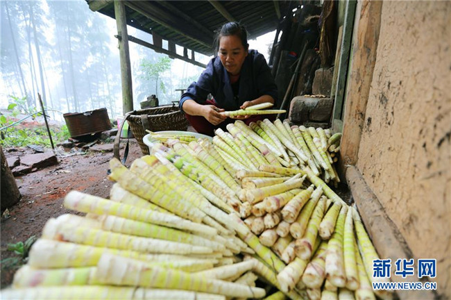 10月14日,在貴州赤水市寶源鄉(xiāng)聯(lián)華村,竹農(nóng)為鮮筍去殼。金秋時(shí)節(jié),貴州省赤水市寶源、兩河口、丙安等鄉(xiāng)鎮(zhèn)種植的5萬余畝大竹筍迎來收獲季。當(dāng)?shù)刂褶r(nóng)加緊采挖竹筍,進(jìn)行加工后外銷。素有“中國(guó)竹子之鄉(xiāng)”的赤水市,現(xiàn)有竹林面積132.8萬畝。竹產(chǎn)業(yè)已經(jīng)成為當(dāng)?shù)孛撠氃鍪盏闹饕乐?。(王長(zhǎng)育 攝)