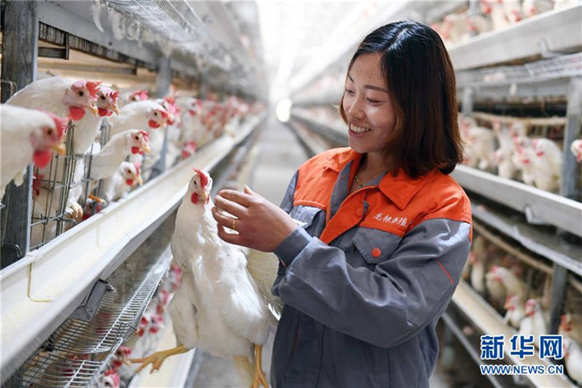 云南省鎮(zhèn)雄縣五德鎮(zhèn)渡船壩社區(qū)農(nóng)家女劉艷外出務(wù)工多年后返鄉(xiāng)創(chuàng)業(yè),帶動(dòng)鄉(xiāng)親們發(fā)展山地生態(tài)雞和優(yōu)質(zhì)蛋雞養(yǎng)殖增收脫貧。這是劉艷在養(yǎng)殖場(chǎng)查看優(yōu)質(zhì)蛋雞(6月4日攝)。新華社記者 楊宗友 攝