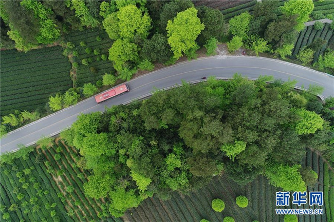 汽車在貴州省遵義市湄潭縣金花村內(nèi)的道路上行駛(4月12日無(wú)人機(jī)拍攝)。 新華社記者 歐東衢 攝