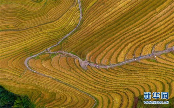 這是10月16日無人機(jī)拍攝的龍脊梯田秋色。金秋時節(jié),廣西龍勝各族自治縣龍脊梯田美如畫卷。 新華社記者 黃孝邦 攝