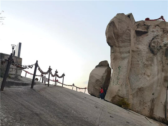 華山以石著名,每一處奇石都有一個(gè)美麗而動(dòng)人的傳說(shuō)。過(guò)了擦耳崖,看到的這兩塊石頭叫“日月巖”,左邊的代表“日”,右邊的代表“月”,上面這四個(gè)字是“云天弧光”,有時(shí)在夜晚,這里會(huì)出現(xiàn)一道非常耀眼的光。相傳武則天當(dāng)年上華山走這里,看到這兩塊形似日月的石頭,就別出心栽地給自個(gè)兒的字號(hào)創(chuàng)造了一個(gè)“瞾”字,因?yàn)檫@兩塊奇石上頂青天,下臨空谷,唯我獨(dú)尊,是光明與權(quán)威的象征。