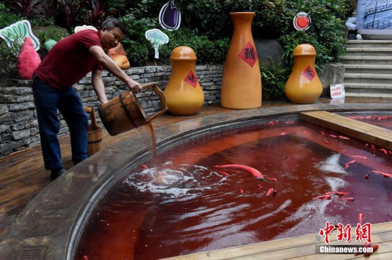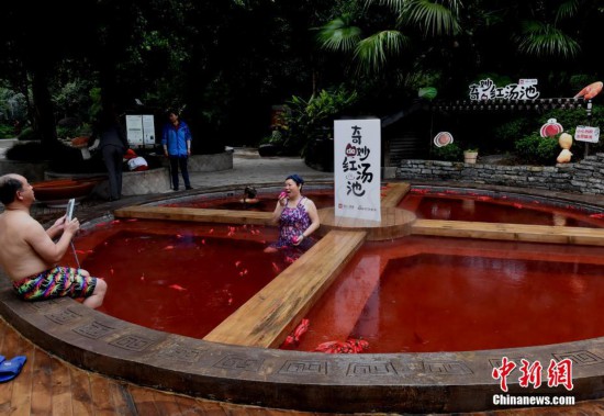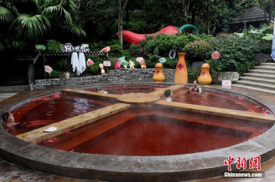 10月18日,市民正在泡“火鍋”溫泉。重慶一溫泉近期推出“奇妙的紅湯池”,直徑6.7米的圓形湯池被改造成一口4格“鐵鍋”,配上紅色的溫泉,如同巨型麻辣火鍋。“火鍋”溫泉湯池里的“火鍋底料”是用雞血藤、艾葉、紅花、首烏等中藥材加上紅酒熬制而成,對人體有一定保健功能。湯池周邊還陳列著鹽罐、油碟、午餐肉、啤酒瓶等裝置,水上漂浮著辣椒道具共同營造出麻辣火鍋的濃烈氣氛。 中新社記者 周毅 攝