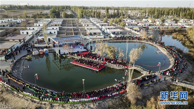 10月22日,在果勒買里村,游客和村民在觀看演出(無人機拍攝)。 新疆巴楚縣阿納庫勒鄉(xiāng)果勒買里村緊鄰巴楚縣城,區(qū)位優(yōu)勢明顯。近年來,新疆維吾爾自治區(qū)體育局“訪民情”“惠民生”“聚民心”駐村工作隊幫助村里完善基礎設施和改善村容村貌,借助節(jié)慶活動大力發(fā)展鄉(xiāng)村旅游,吸引周邊及外地游客前來觀光休閑,既豐富了村民的文化生活,又為村民增收致富拓寬了門路。 新華社記者 胡虎虎 攝