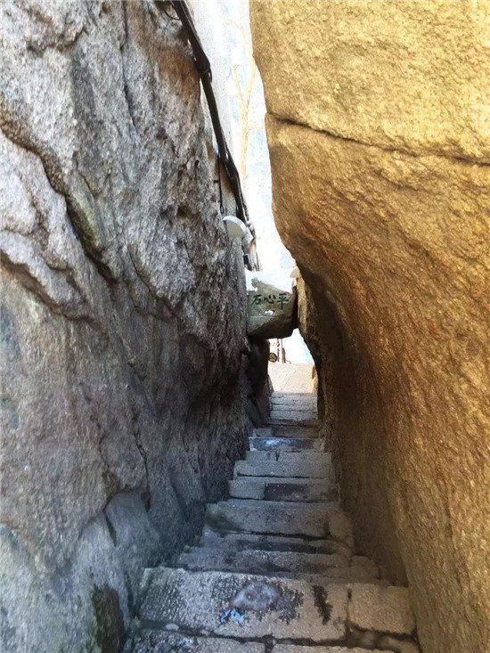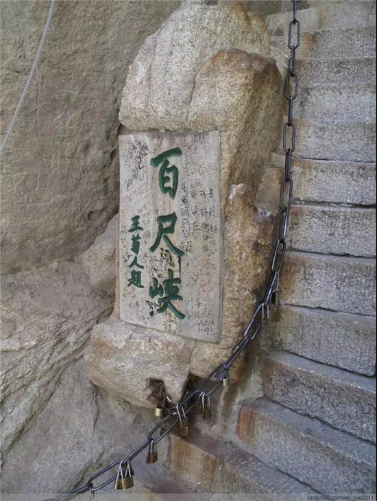 “千尺幢”在華山峪古道“回心石”上,是經(jīng)華山峪登主峰的必經(jīng)之道。這里原為一崖間裂隙,直立70度,后來(lái)人們沿隙鑿?fù)爻陕?,有石階370級(jí),階寬僅容半足,游人登臨時(shí),仰視一線天,俯視若臨深井。