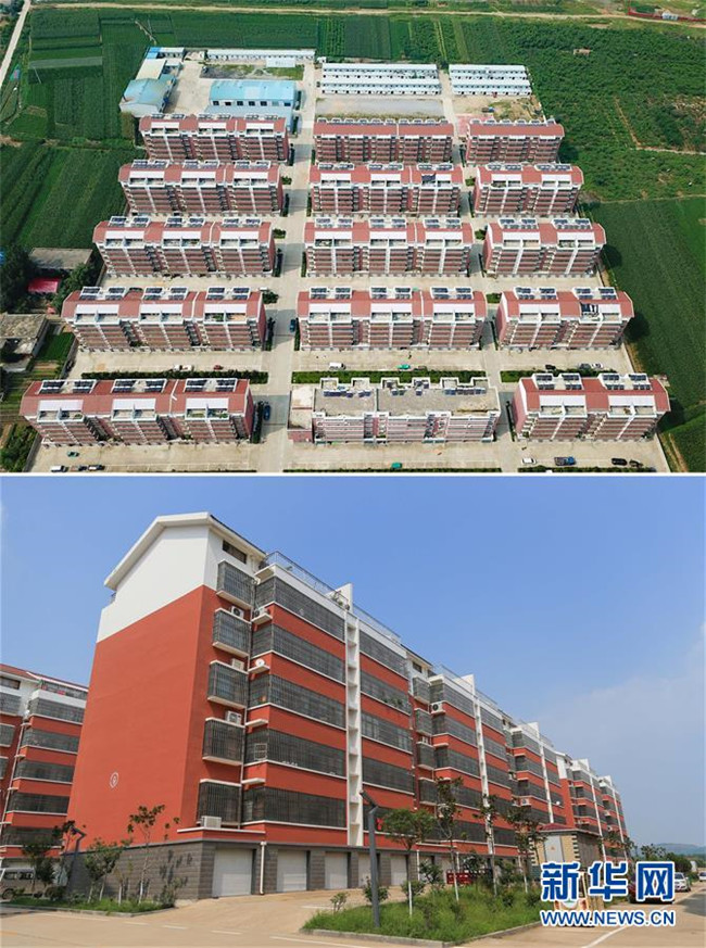 拼版照片(8月22日攝):上圖為無(wú)人機(jī)拍攝的山東費(fèi)縣朱田鎮(zhèn)崔家溝社區(qū);下圖為山東省臨沂市費(fèi)縣朱田鎮(zhèn)崔家溝社區(qū)的居民樓。崔家溝村是遠(yuǎn)近聞名的“光棍村”“貧困村中的貧困村”。2016年3月,崔家溝村在中央異地搬遷政策的扶持下,實(shí)現(xiàn)了整體搬遷,1600多口人搬到了鎮(zhèn)駐地。從此,昔日的“光棍村”,一躍進(jìn)入朱田鎮(zhèn)富裕村行列。新華社記者 王南 攝