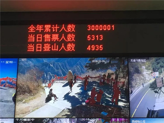截止2018年10月29 日上午11時(shí)43分,華山景區(qū)購(gòu)票人數(shù)突破300萬人次,與去年同期相比增長(zhǎng)60萬人次,增長(zhǎng)率25%,創(chuàng)歷史新高。取得這樣喜人的成績(jī),是華旅集團(tuán)引領(lǐng)企業(yè)發(fā)展新航向、上下求索的碩果,是票務(wù)服務(wù)中心及兄弟單位密切配合,扎實(shí)工作,共同努力的結(jié)果,是干部職工上下一心,不辭辛勞,真抓實(shí)干的效果,是海內(nèi)外游客對(duì)華山景區(qū)優(yōu)美景色,優(yōu)質(zhì)服務(wù)認(rèn)可的成果。