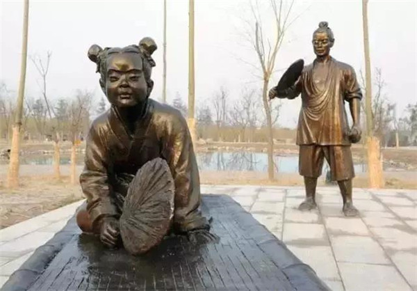 董永,相傳為東漢時(shí)期千乘人,年少喪母,因避兵亂遷居安陸。其后父親亡故,董永賣身至一富家為奴,換取喪葬費(fèi)用。上工路上,于槐蔭下遇一女子,自言無家可歸,二人結(jié)為夫婦。女子以一月時(shí)間織成三百匹錦緞,為董永抵債贖身,返家途中,行至槐蔭,女子告訴董永:自己是天帝之女,奉命幫助董永還債。言畢凌空而去。因此,槐蔭改名為孝感。