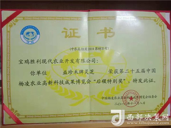 2018年寶雞勝利農(nóng)業(yè)開發(fā)有限公司生產(chǎn)的特色優(yōu)質(zhì)拳頭產(chǎn)品“益珍禾”牌靈芝參展第二十五屆農(nóng)高會(huì),以卓越的品質(zhì)喜獲“后稷特別獎(jiǎng)”。(供稿人:豆清海)