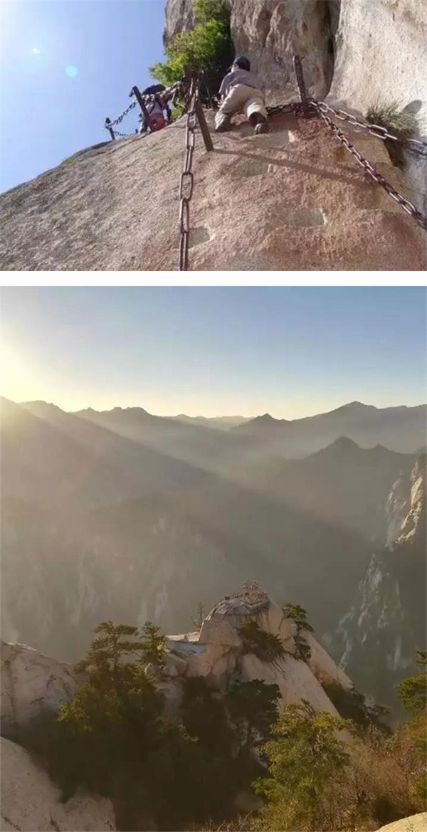 接下來(lái)你將會(huì)挑戰(zhàn)——華山五大險(xiǎn)關(guān)。這五道險(xiǎn)關(guān)分別是千尺幢、百尺峽、老君犁溝、擦耳崖和蒼龍嶺。