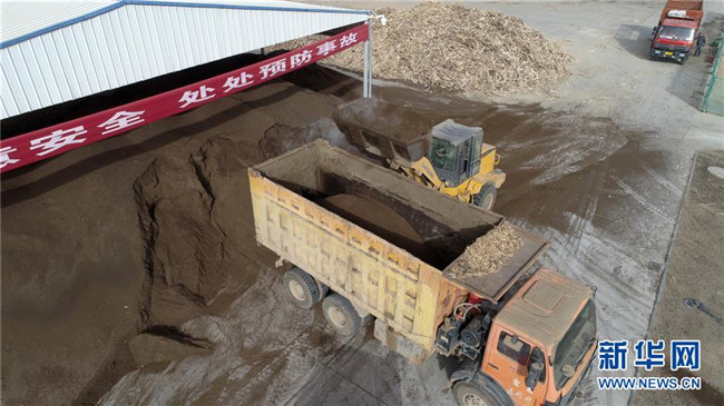 在寧夏青銅峽一家生物質(zhì)燃料生產(chǎn)企業(yè),工作人員操作機(jī)械將秸稈、廢棄木材制成的粉末裝車(11月27日無人機(jī)拍攝)。 新華社記者 王鵬 攝