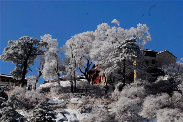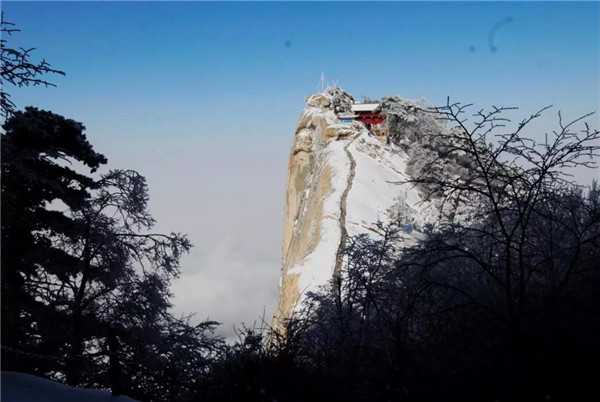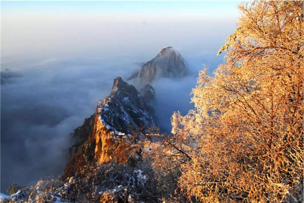 華山在11月下旬進(jìn)入冬季,12月至次年3月是華山雪季。游客可欣賞到難得一見的華山雪景——美麗的霧凇給樹木、巖石、屋舍都披上一層晶瑩的薄衣,尤其在大雪覆蓋后,山景變成一幅曼妙的白色圖畫,峰上的樹木和古藤被透明的冰層包裹,極富魅力。