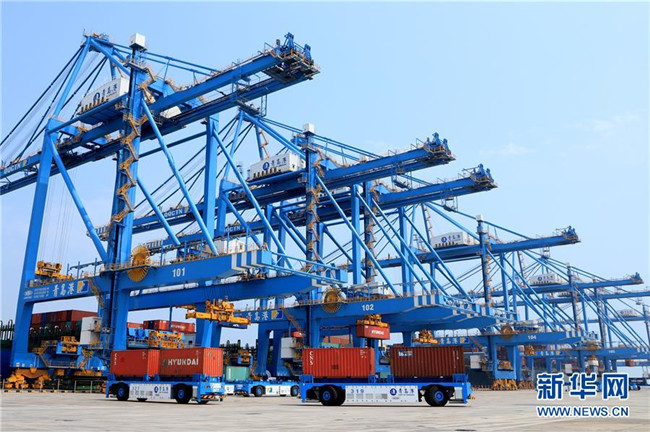 這是2018年5月16日拍攝的青島港全自動(dòng)化集裝箱碼頭。新華社發(fā)(王培珂 攝)
