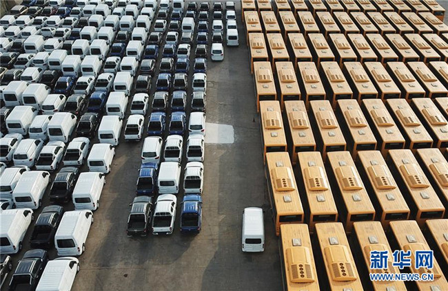 大批國(guó)產(chǎn)車(chē)輛在江蘇連云港港口碼頭等待裝船(2018年12月31日無(wú)人機(jī)拍攝)。新華社發(fā)(耿玉和 攝)