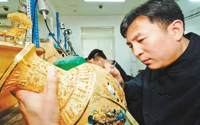 圖為獲得“北京大工匠”稱號的工藝美術(shù)大師陳令勇在進(jìn)行花絲鑲嵌。本報(bào)記者賀勇攝