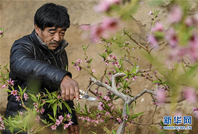 1月27日,在新疆鄯善縣辟展鎮(zhèn)大東湖溫室大棚基地內(nèi),種植戶修剪桃樹花枝。新華社記者王菲攝