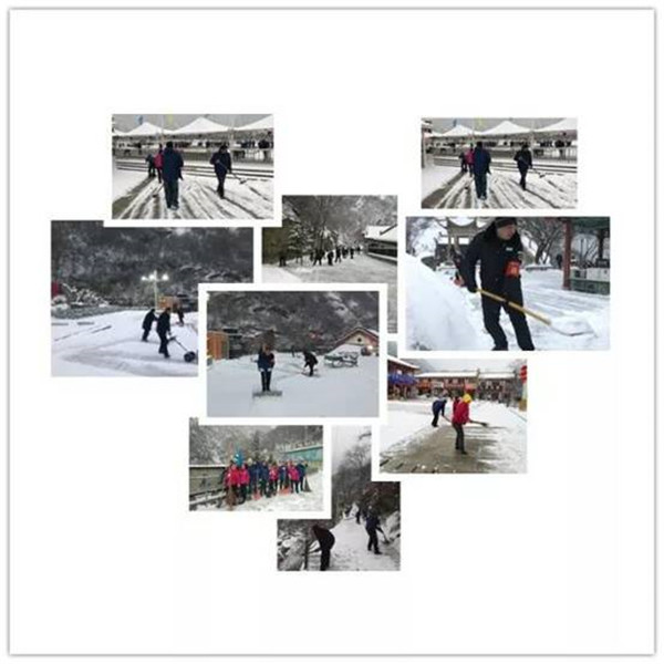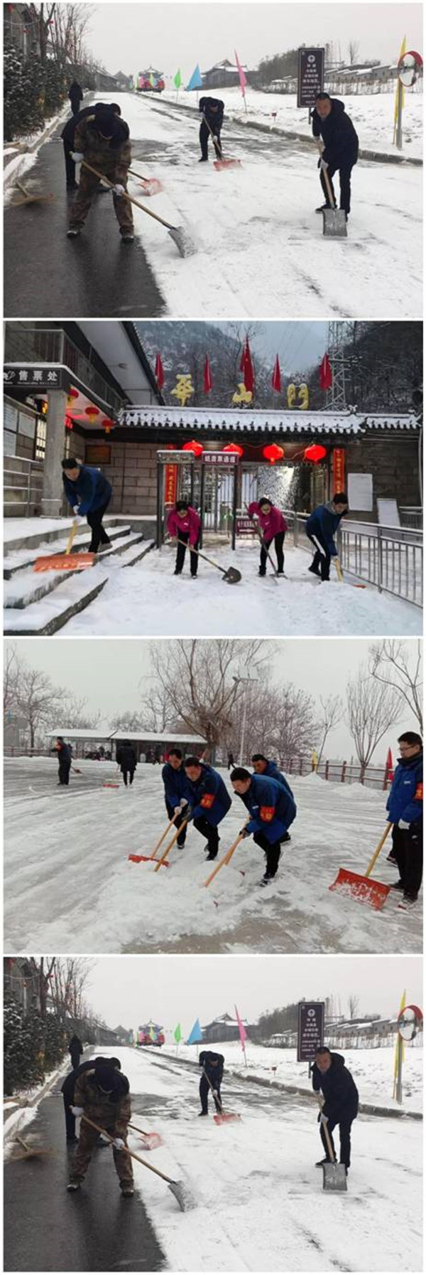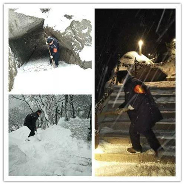 2月9日晚,一場大雪突降華山景區(qū),當(dāng)工作人員與游客一起沉浸在新年的喜悅氛圍時,華山景區(qū)悄然鋪上了一層厚厚的積雪。2月10日早6時,華旅集團(tuán)通過多渠道號召全體員工在各自崗位迅速開展掃雪除冰工作。雪情就是命令,來不及欣賞新年首場雪景,廣大員工扛起掃把鐵鍬等掃雪工具,第一時間奔赴“戰(zhàn)場”,全力確保景區(qū)恢復(fù)運(yùn)營。