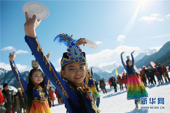 在天山天池景區(qū),小朋友在社火表演中跳舞(2月8日攝)。各地張燈結(jié)彩,處處歡聲笑語,地處中國西北邊陲的新疆各族群眾,新春佳節(jié)期間,耍社火、逛廟會、看演出、玩冰雪,載歌載舞,在濃濃的中華傳統(tǒng)文化氛圍中熱熱鬧鬧過大年。新華社發(fā)(周勇強攝)