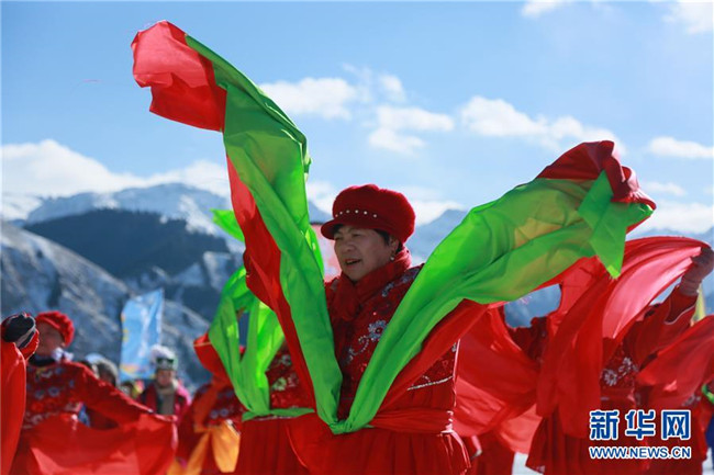 在天山天池景區(qū),老人在社火表演中跳秧歌舞(2月8日攝)。各地張燈結(jié)彩,處處歡聲笑語,地處中國西北邊陲的新疆各族群眾,新春佳節(jié)期間,耍社火、逛廟會、看演出、玩冰雪,載歌載舞,在濃濃的中華傳統(tǒng)文化氛圍中熱熱鬧鬧過大年。新華社發(fā)(周勇強攝)