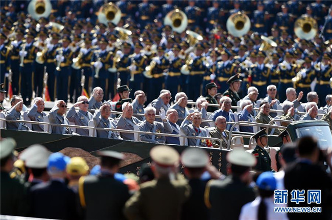 2015年9月3日,中國(guó)人民抗日戰(zhàn)爭(zhēng)暨世界反法西斯戰(zhàn)爭(zhēng)勝利70周年紀(jì)念大會(huì)在北京隆重舉行。這是抗戰(zhàn)老兵乘車(chē)方隊(duì)通過(guò)天安門(mén)廣場(chǎng)。 新華社記者王定昶攝