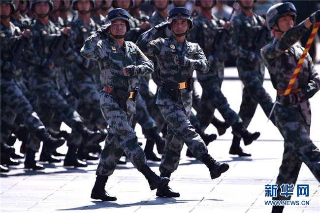 2015年9月3日,中國(guó)人民抗日戰(zhàn)爭(zhēng)暨世界反法西斯戰(zhàn)爭(zhēng)勝利70周年紀(jì)念大會(huì)在北京隆重舉行。這是徒步方隊(duì)通過(guò)天安門(mén)廣場(chǎng)。新華社記者龐興雷攝